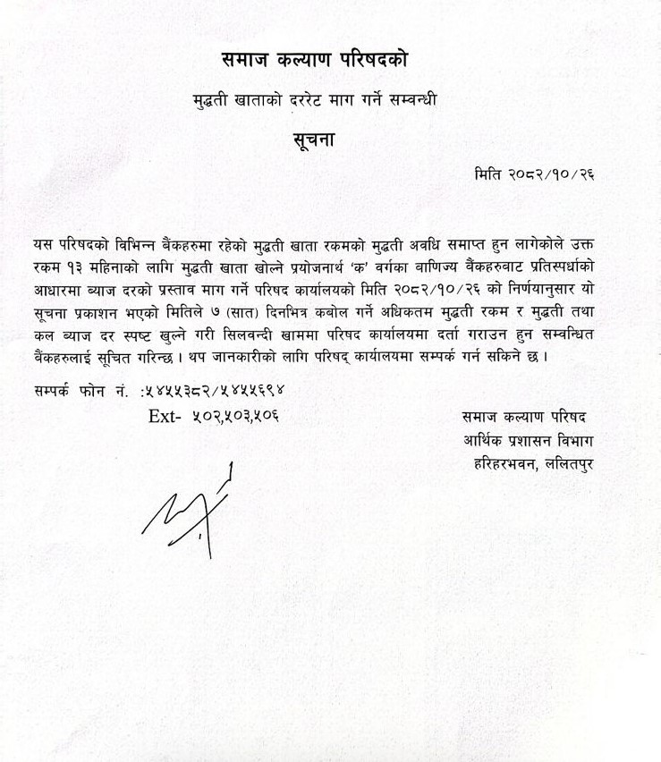 मुद्दती खाताको दररेट माग गर्ने सम्बन्धी सूचना