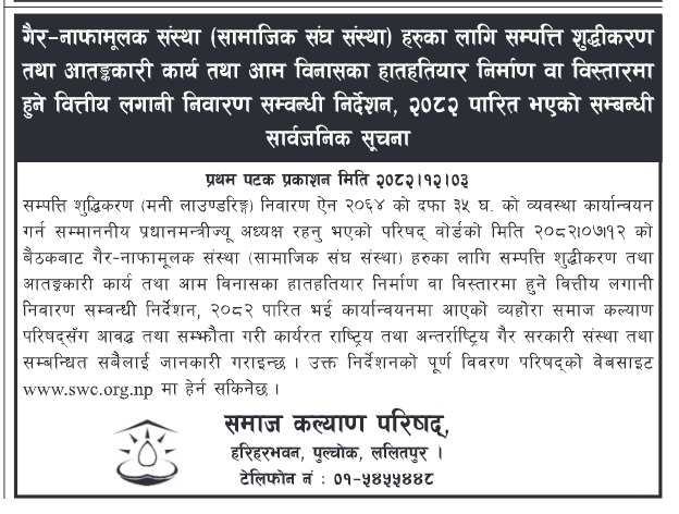 गैर-नाफामूलक संस्था (सामाजिक संघ संस्था) हरुका लागि सम्पत्ति शुद्धिकरण तथा आतङ्ककारी कार्य तथा आम विनासका हातहतियार निर्माण वा विस्तारमा हुने वित्तीय लगानी निवारण सम्बन्धी निर्देशन, २०८२